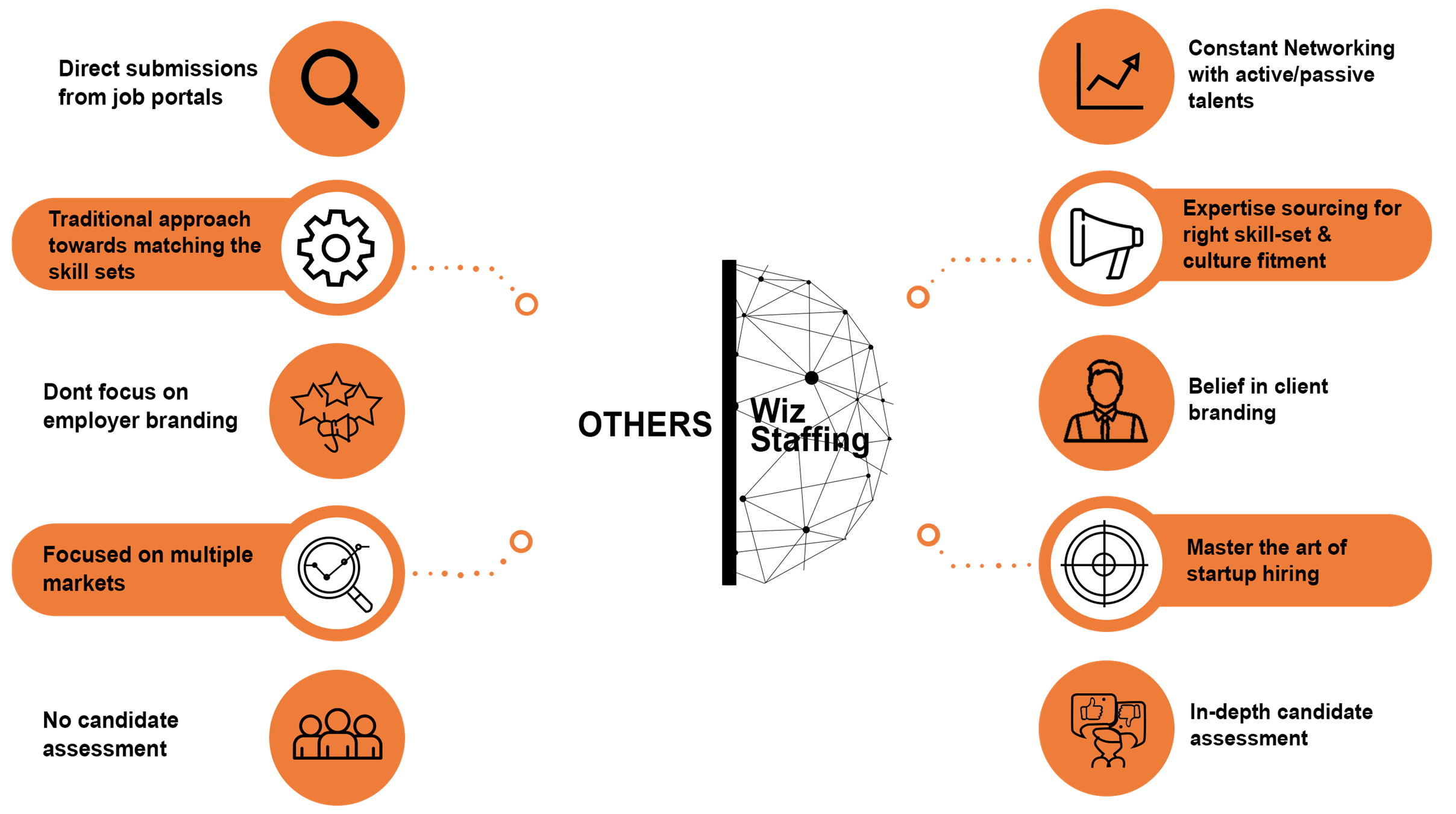 Finding the right technical talent for your business is an arduous task that needs a process, a proven one. We at Wiz Staffing follow a process that goes beyond just matching a probable tech talent’s competency and experience with an employer.Having helped some of India’s biggest businesses hire their technical talents, we are confident of our process and believe that we can help any product company achieve the same level of success with their hiring.